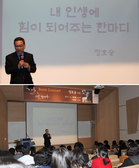 11월 28일(월) 오후 4시부터 우리 대학 사범관 212호 강의실에서는 학생들과 시민 등 100여명이 참석한 가운데 우리 대학 교양교육원의 주최로 시인 정호승 씨를 초청, 『가을, 시를 만나다』라는 주제로 북 콘서트가 열렸다.
