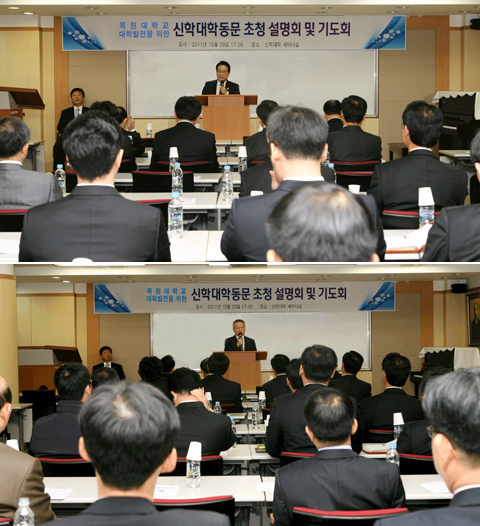 지난 토요일(29일) 오후 5시 본교 신학대학 세미나실에서는 전국 각 지역에서 목회자로 활동하고 있는 모교 출신 목사 100여명이 모인 가운데 ‘대학발전을 위한 신학대학 동문 초청 설명회 및 기도회’를 열었다.