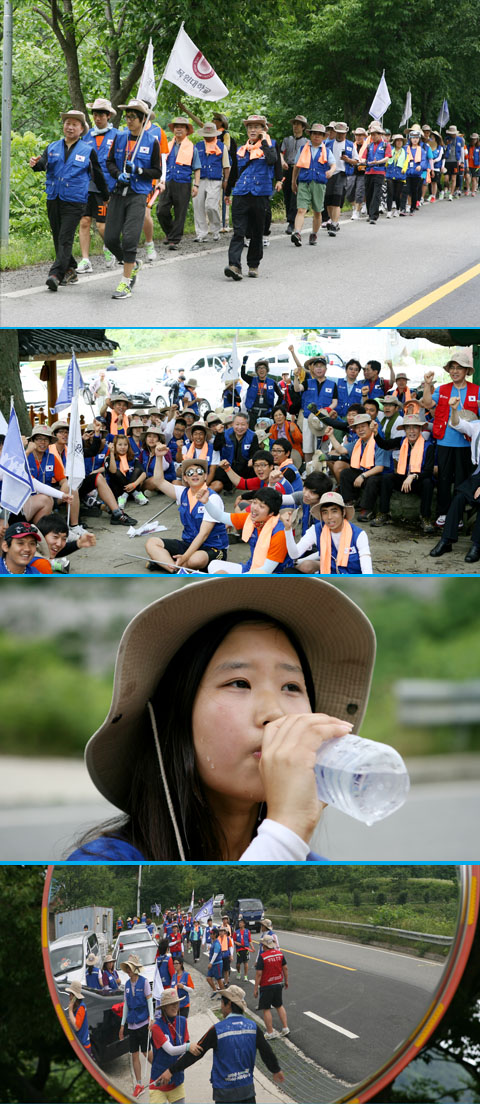 김원배 총장과 본부 교무위원 14명은 6월 30일(목) 낮 12시 30분부터 제4회 국토대장정을 펼치고 있는 우리 대학의 학생들을 찾아 응원과 격려를 하였다. 또한, 경남 함양과 전북 무주 간 약 6Km 구간을 학생들과 함께 걸은 후 전북 무주군 무풍면 소재 식당에서 점심 식사를 같이 하였다.