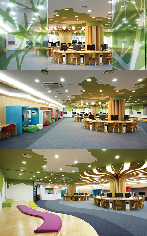 중앙도서관의 뉴미디어플라자는 기존의 도서관고유의 기능과 업무에 더해 특성화된 전문 도서관과 문화 공간을 갖추고 있다. 기존의 도서관 기능에다 젊은 학생들이 선호하는 문화공간과 휴식공간으로 활용할 수 있도록 동화 속 엘리스의 숲속에서 즐기는 듯한 편안한 인테리어로 내부와 외부를 장식하였다.