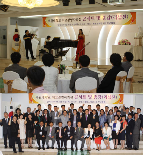 김원배 총장과 교목실장, 대학원장, 조준희 교수, 정재호 교수 등 제 1기 최고경영자과정 원우회장 외 45명이 참석한 가운데 콘서트 및 종강을 가졌다.