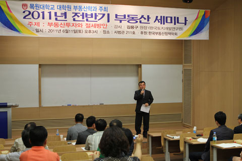 지난 6월 11일(토) 우리 대학교 대학원 부동산학과(주임교수 정재호)주관으로 “부동산투자와 절세방안”이라는 주제로 2011년도 전반기 부동산 세미나가 성공리에 개최됐다.