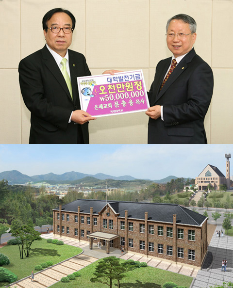 4월 14일(목) 오전 11시 30분 우리 대학교(총장 김원배) 본부 회의실에서는 서울 양천구에 위치한 은혜감리교회 문충웅 담임목사와 교회 임원들이 김원배 총장을 방문, ‘구(舊) 신학관’을 복원하는데 써 달라며 5천만원의 학교발전기금을 기부하였다.