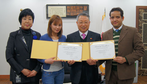 1월 4일(화) 오후 4시 30분 총장실에서 김원배 총장은 사단법인 전국여교수연합회에서 지급하는 장학금을 김영순 교수(미술대학 섬유-패션코디네이션과)의 추천으로 신학대학원 네팔 유학생 비스누라즈밧(BHAT BISHNU RAJ) 학생과 공과대학 도시공학과 몽골 유학생 옌자(YANJINBILEG BALJINNYAM) 학생에게 전달하였다.