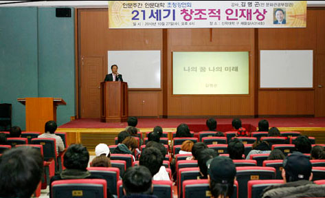 26일(화)부터 28일(목)까지 인문대학학생회에서 주최하는 ‘인문주간 행사’의 일환으로 진행되는 이번 초청강연회에서 김명곤 씨는 ‘문화의 시대에 가장 필요한 능력은 창조적 감성의 능력이며, 열정과 꿈을 가진 대학생들에게 창의력으로 무장한 21세기의 창조적 인재로 거듭나기 위한 밝고 건강한 젊은이의 미래상을 제시’하였다.