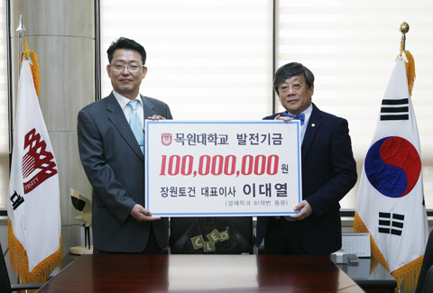 지난 24일(수) 오전 10시 30분 총장실에서 교내 관계자들이 참석한 가운데, (주)장원토건 이대열 대표이사로부터 1억원의 학교 발전기금을 전달받았다.