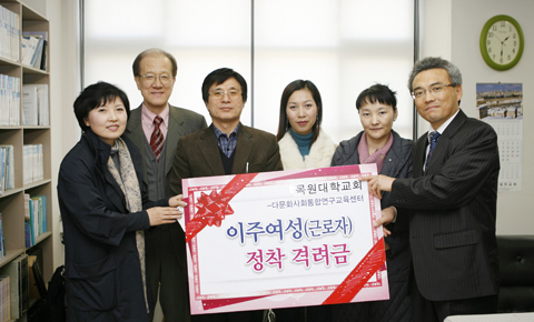 3일(수) 오후 2시 목원대학교회(김홍관 목사)로부터 한국남성과 결혼한 여성가운데 생계가 곤란한 여성결혼이민자에게 한국생활격려금으로 사용해달라는 지정기부금을 받게 된 다문화사회통합연구교육센터는 교육생 강금자씨(베트남)와 체렌수렌씨(몽골)에게 각각 격려금을 전하는 전달식을 가졌다.
