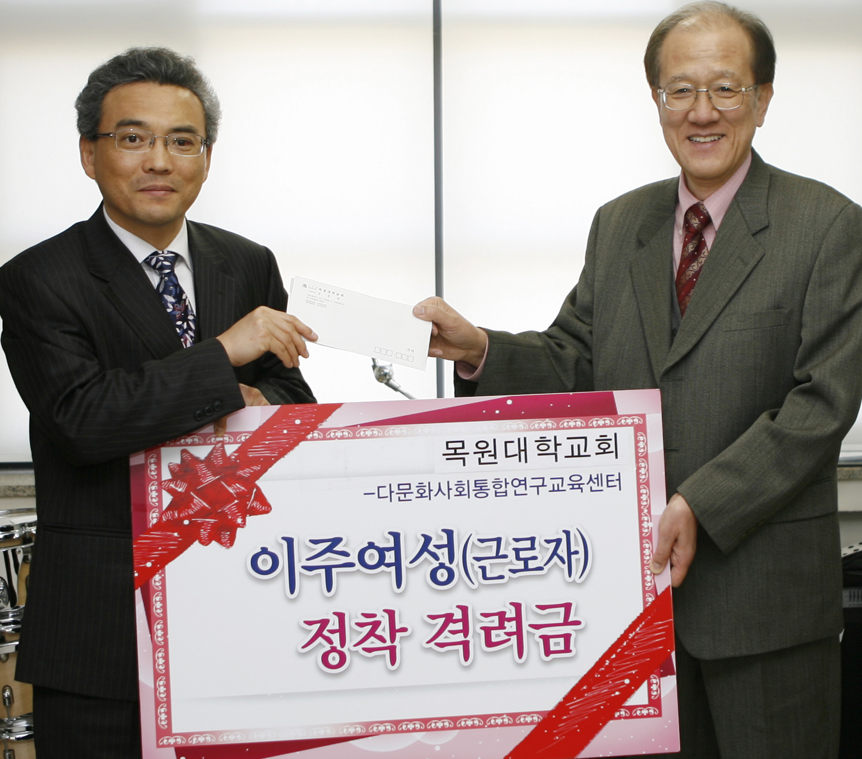 3일(수) 오후 2시 목원대학교회(김홍관 목사)로부터 한국남성과 결혼한 여성가운데 생계가 곤란한 여성결혼이민자에게 한국생활격려금으로 사용해달라는 지정기부금을 받게 된 다문화사회통합연구교육센터는 교육생 강금자씨(베트남)와 체렌수렌씨(몽골)에게 각각 격려금을 전하는 전달식을 가졌다.