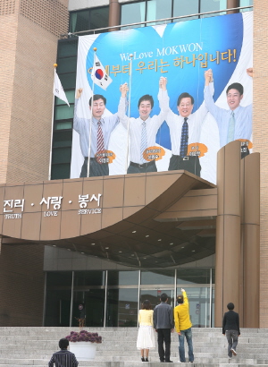 지난 3월 30일 목원대 도서관 정면에 대형 현수막이 내걸린 것. 이요한 총장과 이정호 교수협의회장, 김호정 직원 노조지부장, 신동수 총학생회장이 서로 손을 높이 맞잡은 CF같은 사진이었다.