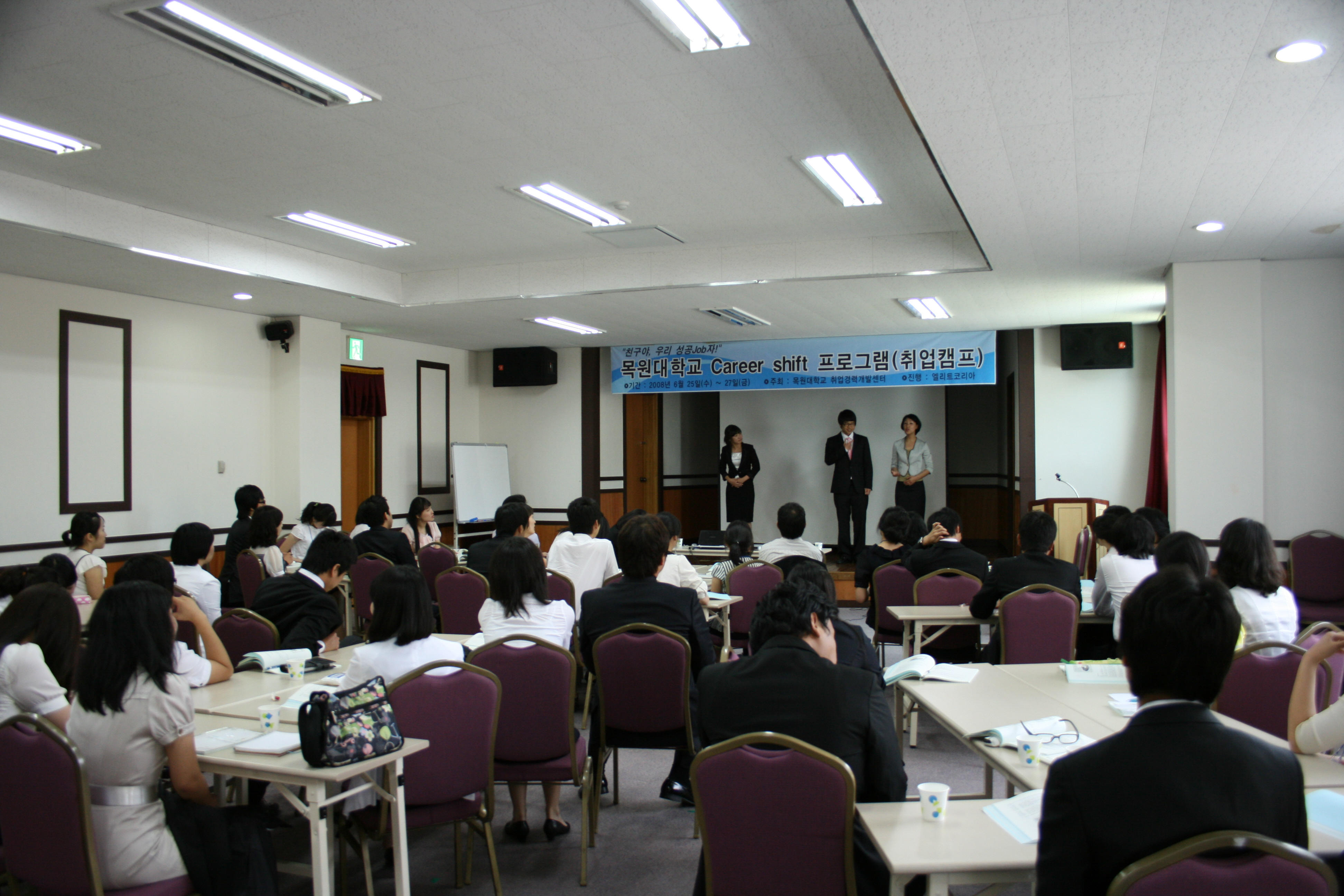 목원대학교 취업경력개발센터에서 지난 6월 25일 ~27일까지(2박3일) 충북 단양 대명리조트에서 제 3기 career Shift Program(취업캠프)이 개최되었습니다. 입사서류 클리닉부터 면접까지 취업 대비 마스터 과정으로 구성된 이번 캠프는 캠프에 참여한 50명의 학생들의 뜨거운 호응을 얻었습니다.[1일차][실전프로그램]10초만에 합격하는 입사서류작성법[리더십프로그램]나는 내 삶의 무대에서 주인공인가[TeamProject]99초를 잡아라![팀별실습]취업성공 전략 Plan[2일차][이미지메이킹실습]첫인상으로 인사담당자를 사로잡아라! [실전프로그램]백전백승 유형별 면접전략[면접실습]면접 Role Play 실습[스피치실습]합격을 부르는 Power speech[팀별실습]입사서류 작성
