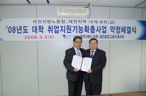 2008년 3월 5일 대전지방노동청 고용안정지원센터에서 학생처 장동욱 처장과 취업경력개발센터 김선명 계장이 참석한 가운데 목원대학교와 대전지방노동청이 대학취업지원기능확충사업 약정 체결식을 가졌습니다.
