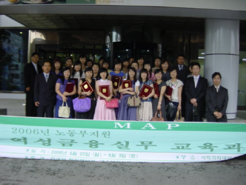 올 3월 초 『노동부 지원 대학 취업지원기능 확충사업』에 선정되어 학생처 취업정보실 주최로 5월 22일부터 6월 3일까지 10일 간 진행된 ""여성금융실무 교육과정""은 여성 금융실무 전문가로 변화하기 위한 Woman-power 역량을 강화시키기 위한 교육이었습니다.