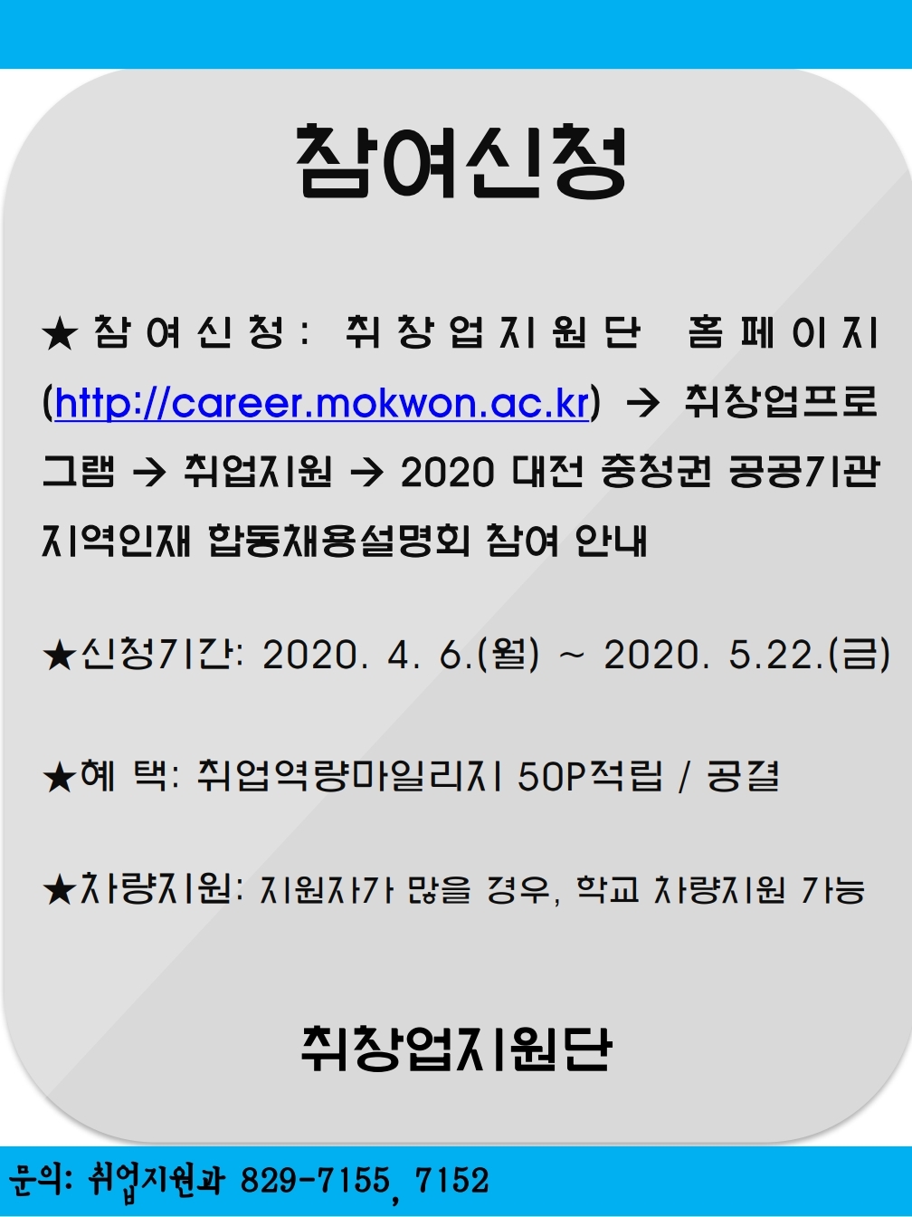 바. 참여신청: 취창업지원단 홈페이지(http://career.mokwon.ac.kr) -> 취창업프로그램 -> 취업지원 -> 2020 대전 충청권 공공기관 지역인재 합동채용설명회 참여 안내
