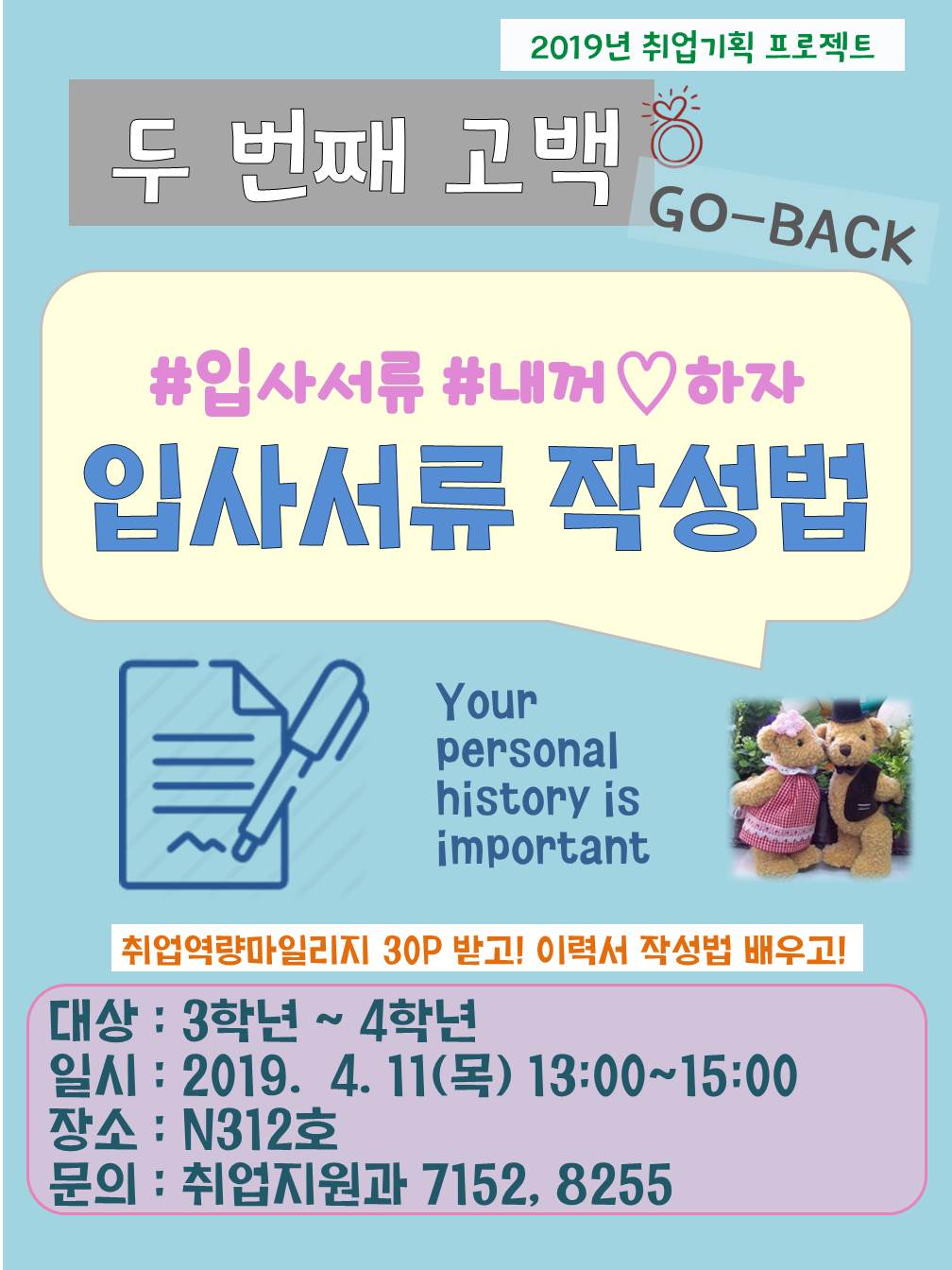 취업지원과에서는 재학생들의 입사서류 작성과 관련하여 취업역량을 강화시키고, 취업에 대한 마인드를 고취시키기 위하여 “두 번째 고백, #입사서류 #내꺼♡하자!” 를 아래와 같이 운영하고자 하오니 학과 학생들이 적극적으로 참여할 수 있도록 안내하여 주시기 바랍니다.