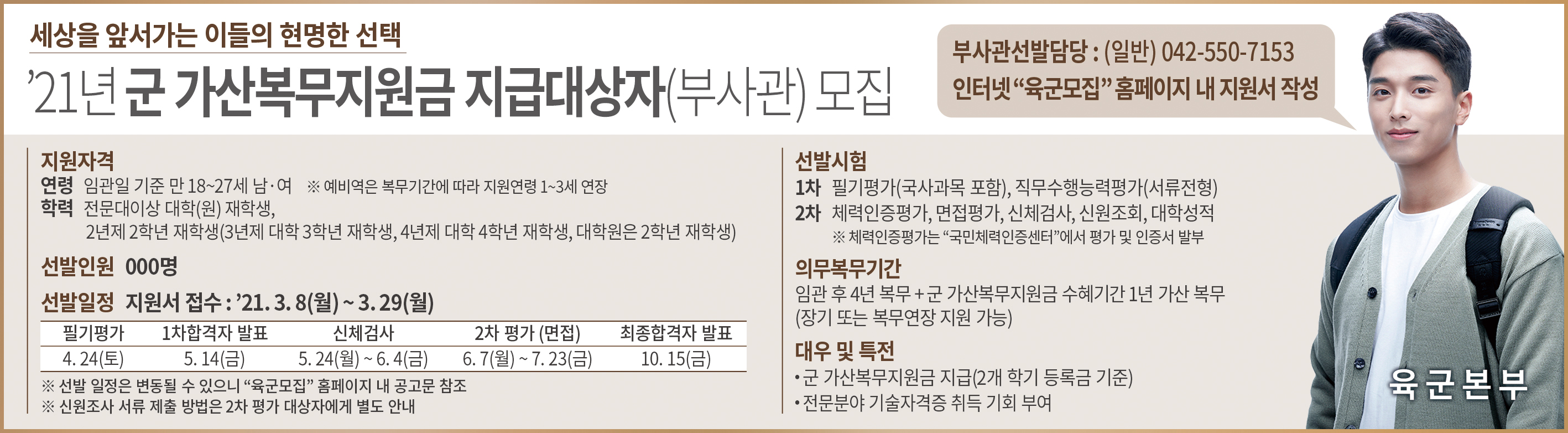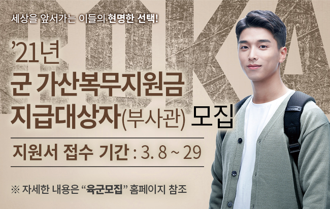 2. '21년 군 가산복무지원금 지급대상자(부사관) 모집 이미지(신문/포스터/배너) 각 1부. 끝.