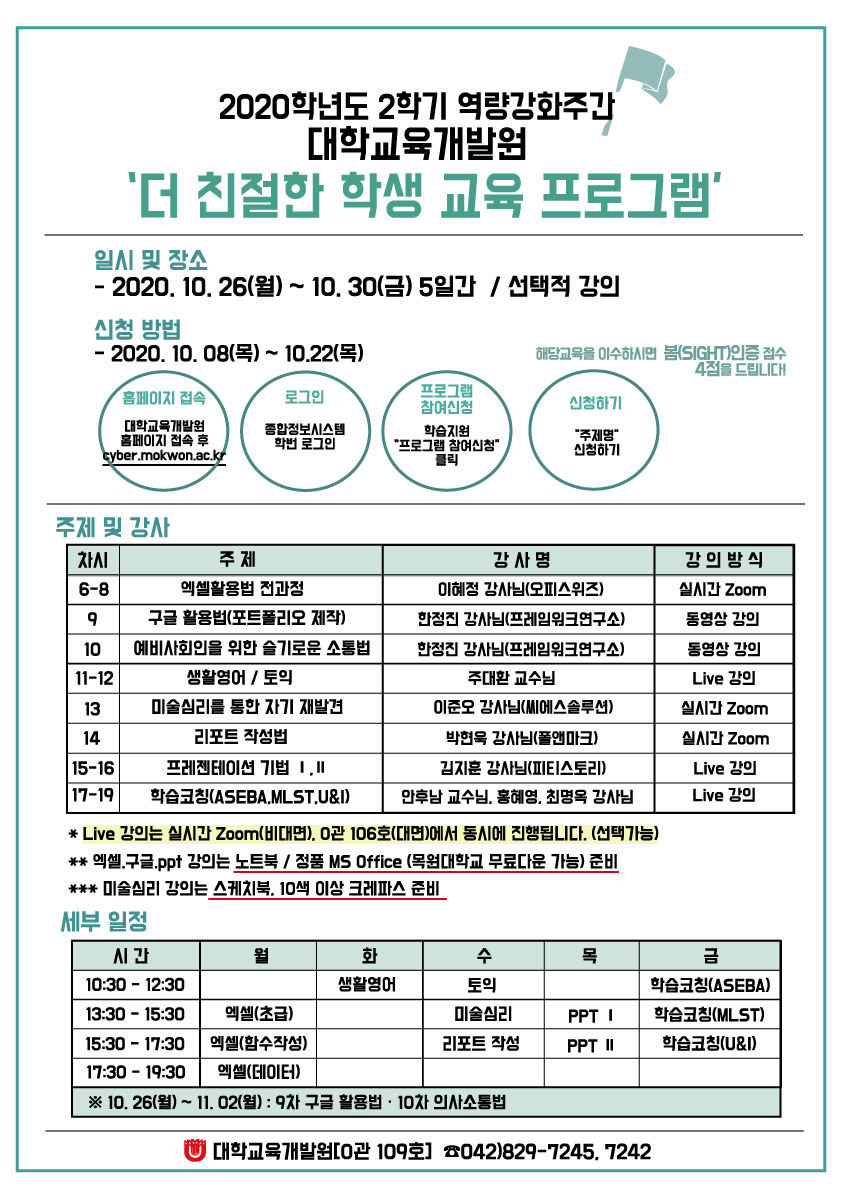 뜻이 있는 사람은 반드시 성공한다대학교육개발원에서는 역량강화주간에 [혁신222_국고] 2020학년도 ‘더 친절한 학생 교육 프로그램’을 진행하오니, 많은 학생들의 바랍니다.