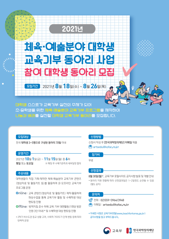 1) 사업명 : 2021년 체육·예술 분야 대학생 교육기부 동아리