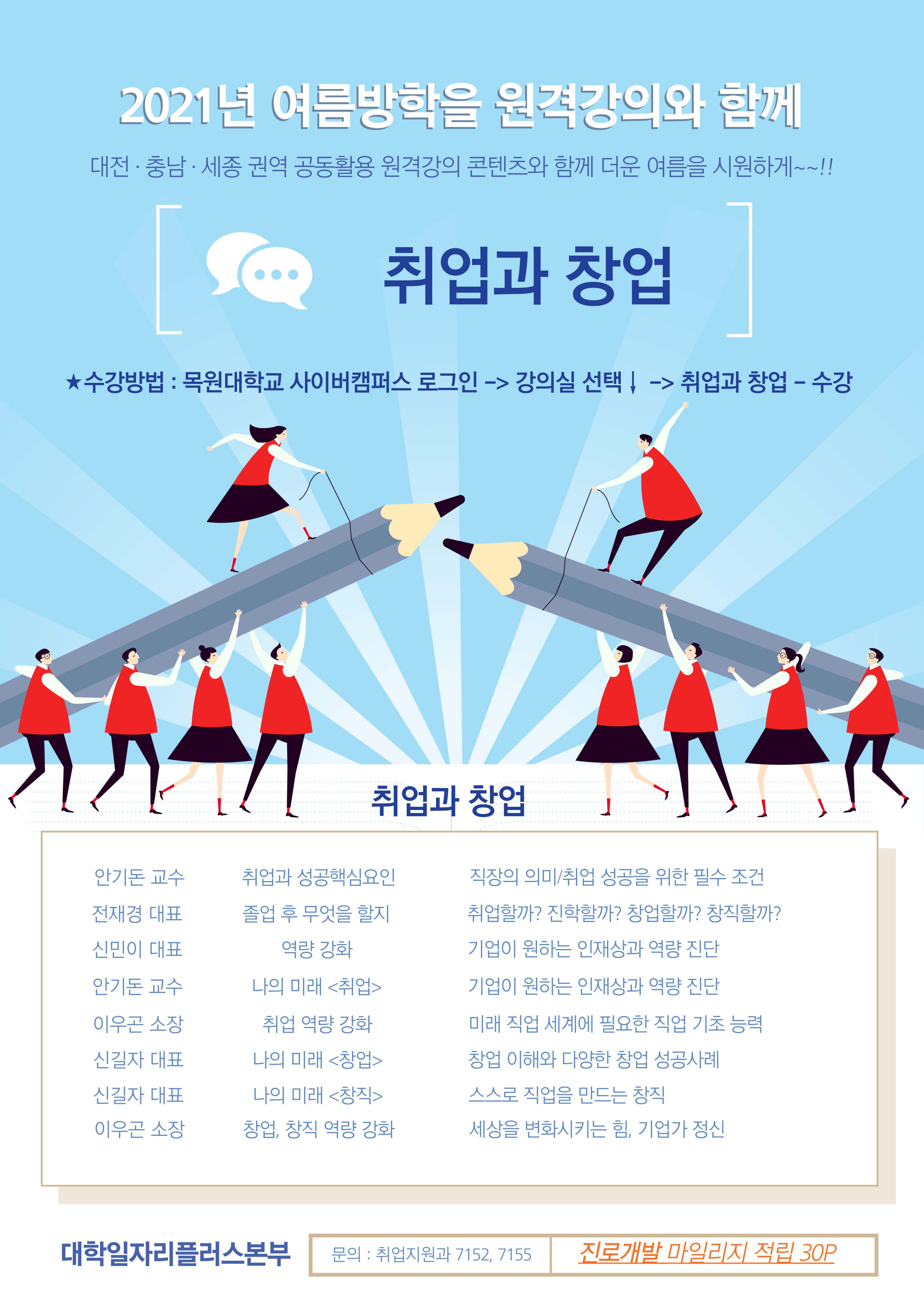 마. 수강방법 : 목원대학교 사이버캠퍼스(http://cyber.mokwon.ac.kr) >> 로그인 >> 강의실 선택↓ >> 대학생활과 진로설계 또는 취업과창업 선택 >> 수강