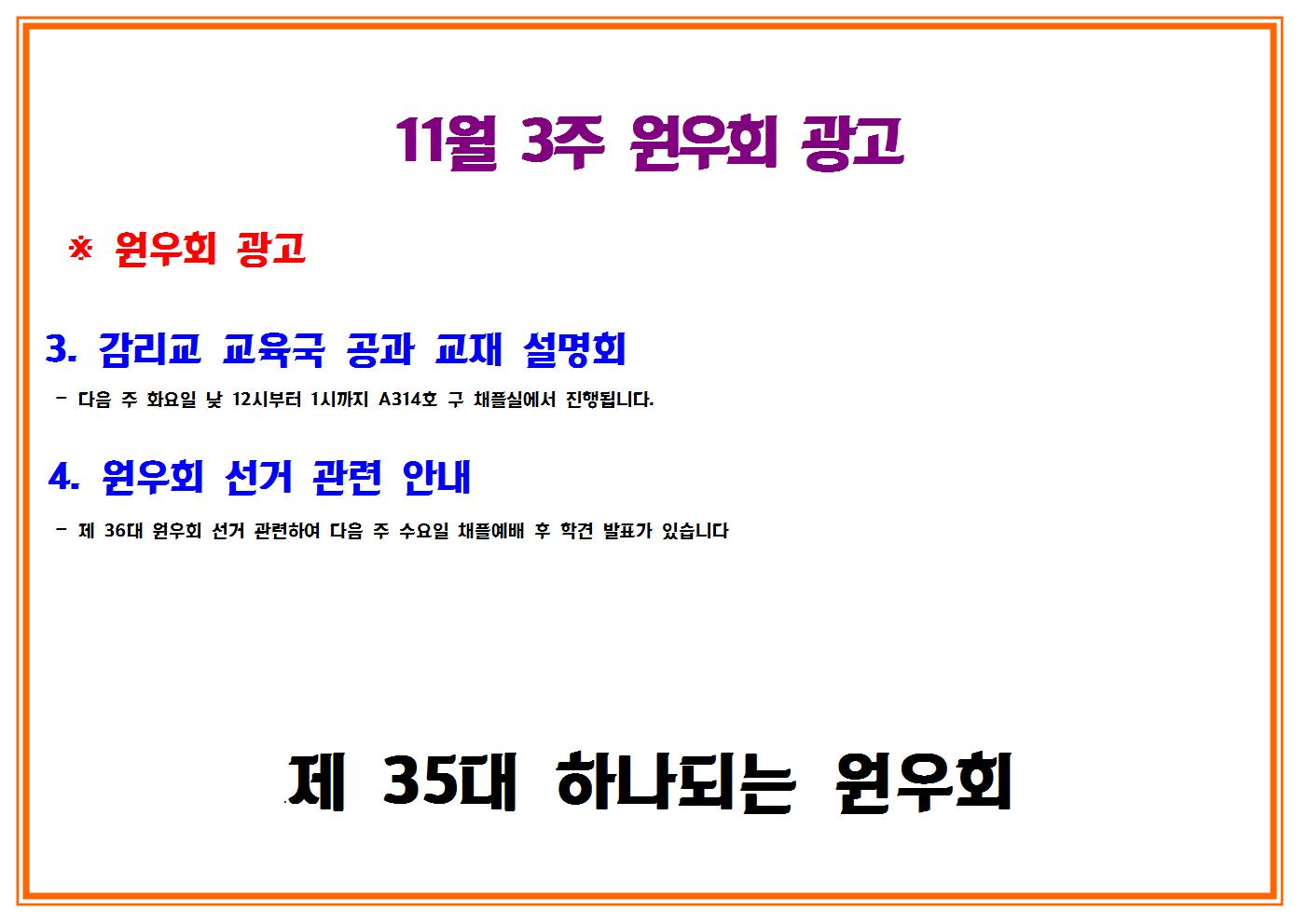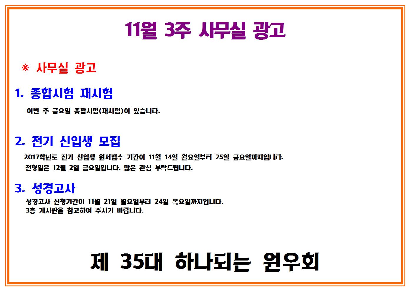 WESLEY GRADUATE SCHOOL OF사무실 광고입니다. 1. 이번 주 금요일 종합시험(재시험)이 있습니다. 2. 2017학년도 전기 신입생 원서접수 기간이 11월 14일 월요일부터 25일 금요일까지입니다. 전형일은 12월 2일 금요일입니다. 많은 관심 부탁드립니다. 3. 성경고사 신청기간이 11월 21일 월요일부터 24일 목요일까지입니다. 3층 게시판을 참고하여 주시기 바랍니다. 원우회 광고입니다. 1. 청사모사 관련 안내입니다. - 다음 주 11월 21일 월요일 저녁 7시부터 A314호에서 CTS라디오 번개탄이 주최하는 청소년을 사랑하는 모든 사역자들이 마음을 나누는 날(청사모사 맘데이)이라는 주제로 모임을 가지게 됩니다. - 다음 세대, 특히 청소년을 사랑하고 준비하시는 모든 원우님들에게 유익한 시간이 될 것입니다. 신학관 내부 곳곳에 포스터가 붙어 있으니 자세한 프로그램과 일정을 참고하시어 많은 원우님들의 참여를 바랍니다. 2. 수련목 모의고사 관련 안내입니다. - 다음 주 11월 21일 월요일 오후 7시 신대 1층 A109호에서 진행됩니다. 3. 감리교 교육국에서 진행하는 2017년 공과 교재 설명회가 다음 주 화요일 낮 12시부터 1시까지 A314호 구 채플실에서 진행됩니다. 원우님들의 많은 참여를 바랍니다. 4. 2017년 36대 원우회 선거관련 안내입니다. - 제 36대 원우회 선거 관련하여 다음 주 수요일 채플예배 후 학견 발표가 있습니다. * 글 정렬이 제대로 올려지지 않아 첨부파일을 참고하시면 깔끔하게 보실 수 있습니다.