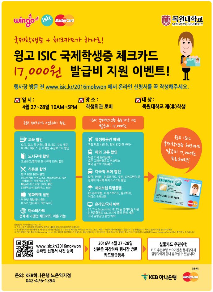 무료(국제학생증 발급비 17,000KEB하나은행 부담)