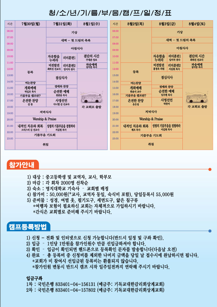 한국의 미래를 책임질 청소년들이 강력한 성령의 기름부음을 통한 내적치유와 비전설정을 경험함으로 하나님의 거룩한 인재로 거듭나기를 소원하며 아래와 같은 캠프에 여러분을 초대합니다.