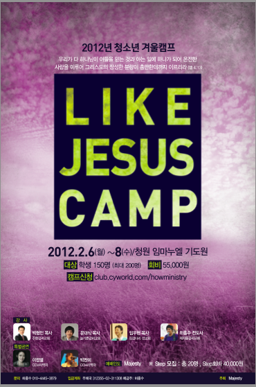 WESLEY GRADUATE SCHOOL OF날짜를 잘못 적었습니다. 변경된 날짜입니다. 청소년 캠프입니다!! 대형캠프가 아닙니다. 150~200명 개교회 수련회와 같은 캠프 원하시는 분들 환영하십니다! 미자립교회 청년들도 환영합니다. 최고의 강사진으로 최상의 환경에서 기다립니다! 성령충만하길 원하시는 분들 오세요~~~ㅋ Like Jesus Camp 일시: 2012. 2 . 2 ~ 4 (목~토) 장소: 청원 임마누엘수양관 (청주임마누엘교회 기도원) 강사: 박형민목사, 문대식목사, 하흥수전도사 회비: 55000원 예배인도: Majesty 문의: 010-4445-3879 (하흥수전도사)