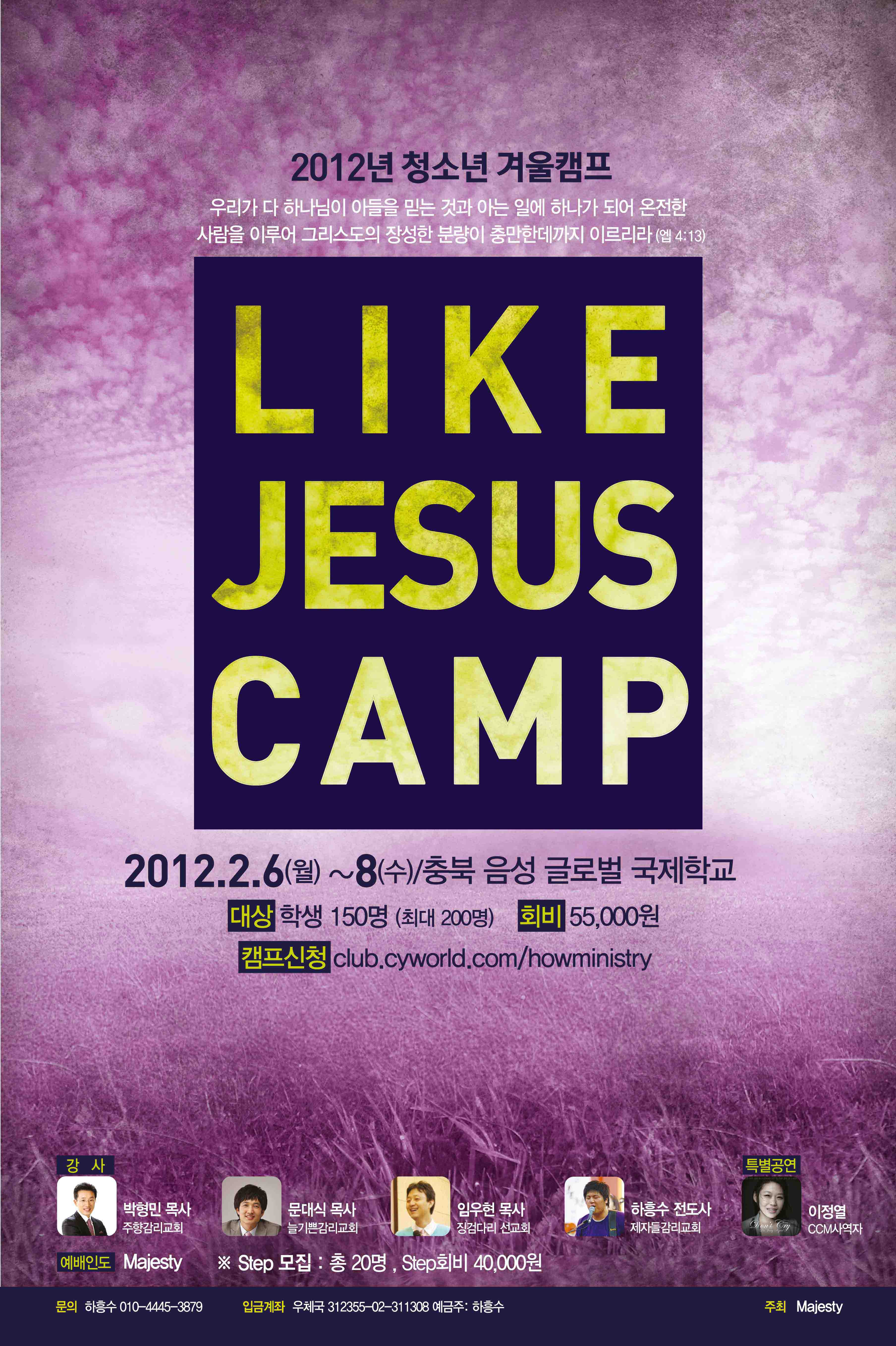 WESLEY GRADUATE SCHOOL OF청소년 캠프입니다!! 미자립교회 청년들도 환영합니다. 최고의 강사진으로 최상의 환경에서 기다립니다! 성령충만하길 원하시는 분들 오세요~~~ㅋ Like Jesus Camp 일시: 2012. 1 . 6 ~ 8 (월~수) 장소: 청원 임마누엘수양관 (청주임마누엘교회 기도원) 강사: 박형민목사, 문대식목사, 임우현목사, 하흥수전도사 회비: 55000원 예배인도: Majesty 문의: 010-4445-3879 (하흥수전도사)