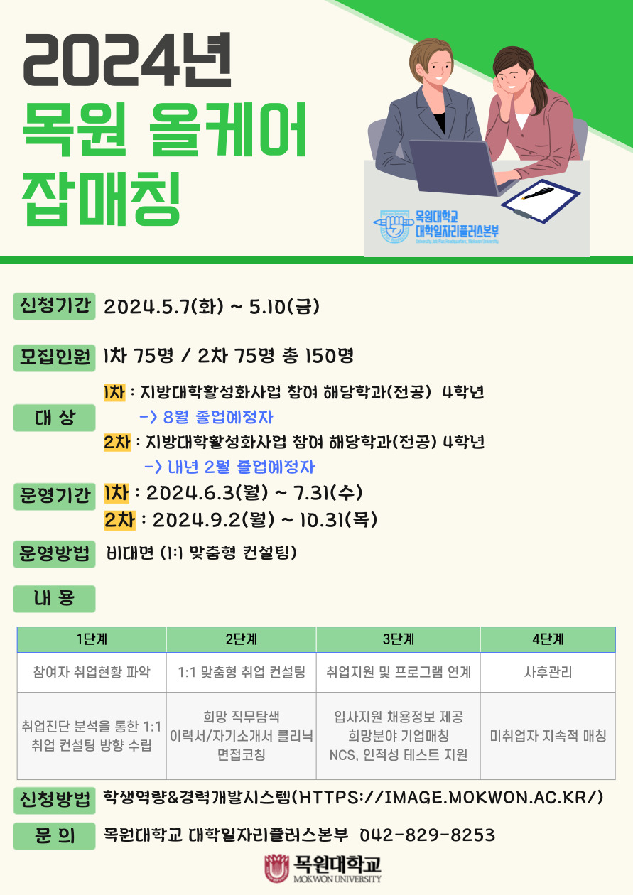 대학일자리플러스본부에서는 지방대학활성화사업과 관련하여 분야별 취업컨설팅 및 일자리매칭 프로그램인 '2024년 목원 올케어 잡매칭'프로그램을 운영합니다. 특성화 대상학과 4학년 졸업예정자들을 2개월간 집중관리하며 일자리매칭을 하는 프로그램으로, 참여학생들의 취업역량 강화 및 취업연계까지 가능한 프로그램이니 많이 참여하여 주시기 바랍니다.