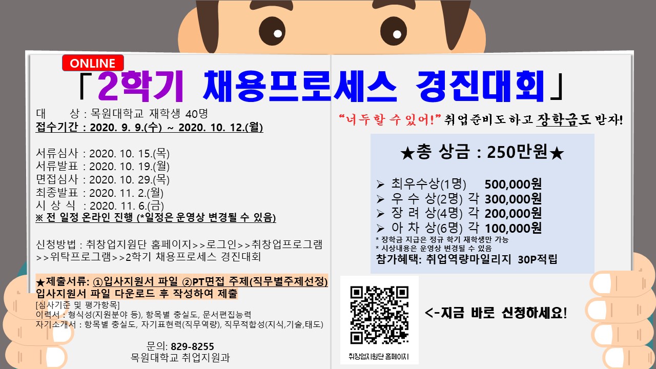 목원대학교 취업지원과에서 진행하는 "2020-2학기 채용프로세스 경진대회" 안내하오니 관심있는 학생들은 참여 부탁드립니다.