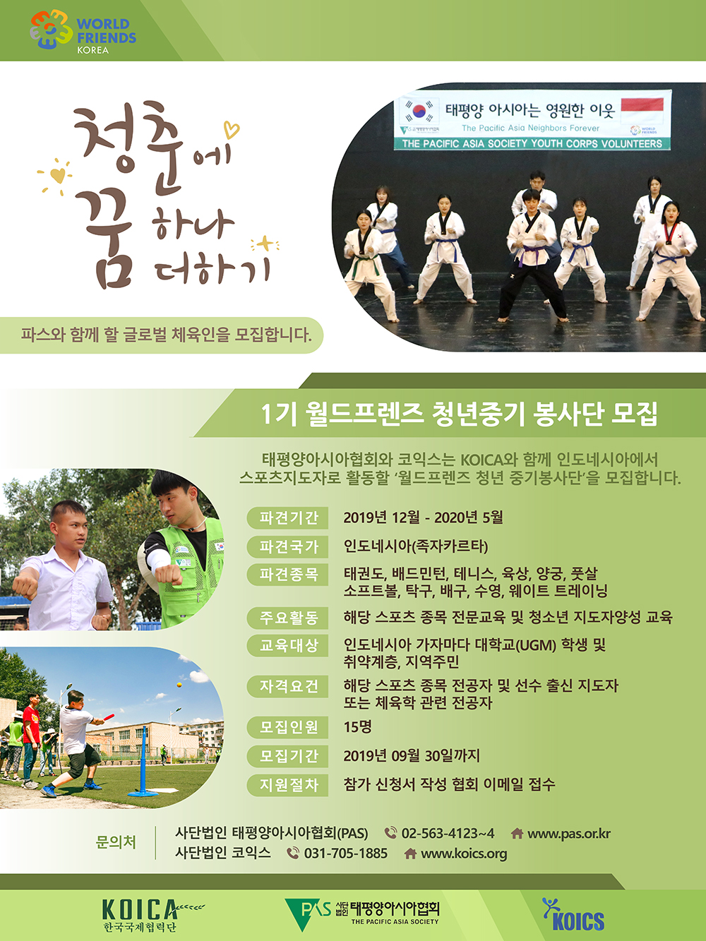 사회봉사지원센터·장애지원센터태평양아시아협회와 코익스 koica와 함께 인도네시아에서 스포츠지도자로 활동할 월드프렌즈 청년 중기봉사단을 모집하오니 많은 관심과 신청바랍니다. 파견기간 : 2019년 12월 ~ 2020년 5월 파견국가 : 인도네시아(족자카르타) 모집기간 : 2019년 9월 30일까지 지원방법 : 참가신청서 작성 후 이메일 접수(pasyouth@hanmail.net) 자세한 사항은 첨부파일을 확인해주세요! |
