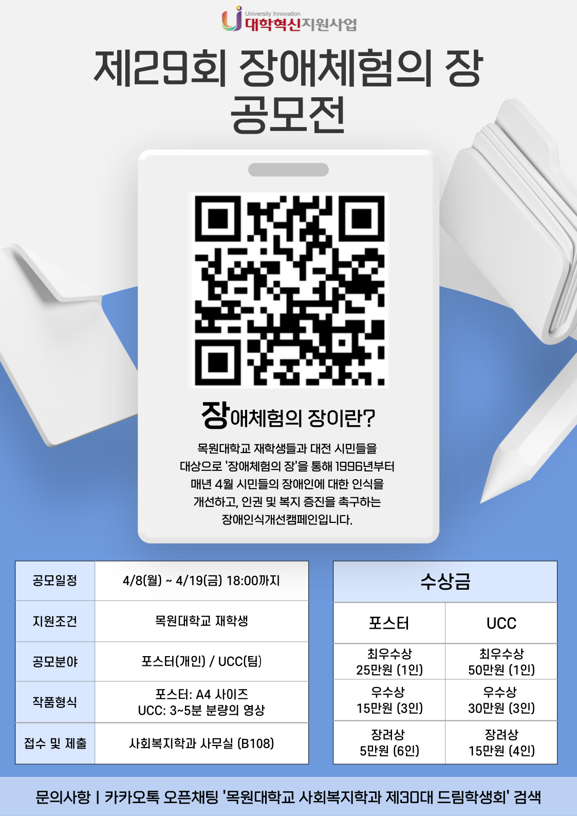 • A4 사이즈로 장애인식개선 관련 포스터 제작 후, 사회복지학과 사무실 서면 제출 • 우수작은 교내 게시판 게시 예정 |