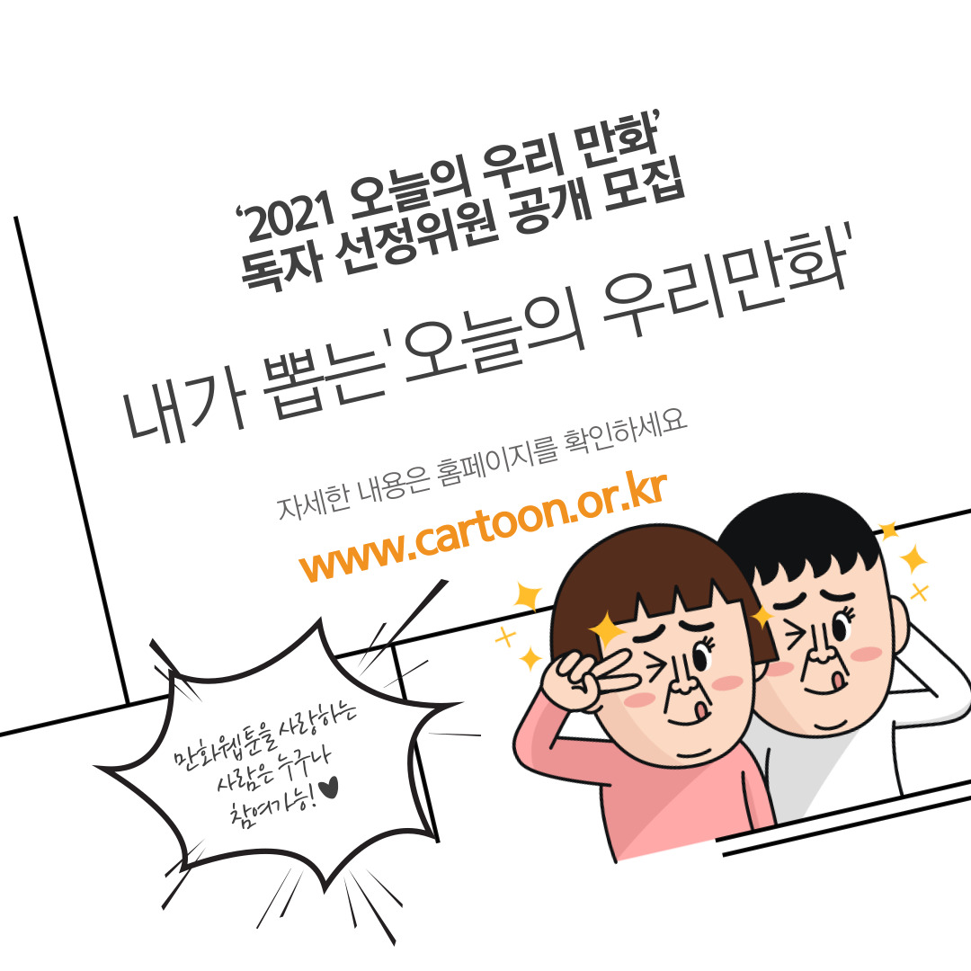 문화체육관광부가 주최하고 한국만화가협회와 한국만화영상진흥원이 주관하는 '2021 오늘의 우리 만화' 작품 선정을 위한 독자 선정위원을 공개 모집합니다.