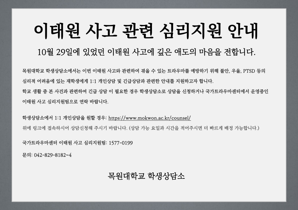 적극적으로 관심을 기울여 주시고, 도움이 필요 한 학생이 있을 경우 아래의 연락처를 참고하시어 학생상담소를 통해 상담을 받을 수 있 도록 연계하여 주시거나 국가트라우마센터에서 운영 중인 이태원 사고 심리지원팀으로 연락하여 주시기 바랍니다.