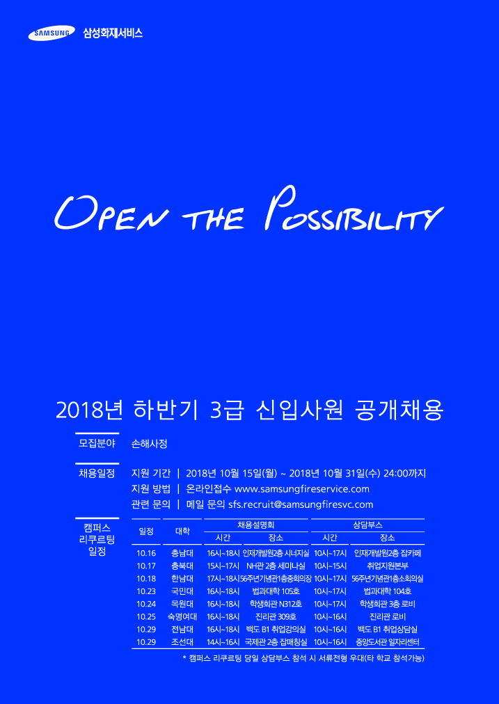 취업지원과에서는 본교 재학생을 대상으로 2018년 하반기 삼성화재서비스 신입사원 공개 채용상담회&설명회 진행함을 알려드리오니 각 학부(과)에서는 관심있는 학생들이 참여할 수 있도록 홍보하여 주시기 바랍니다.