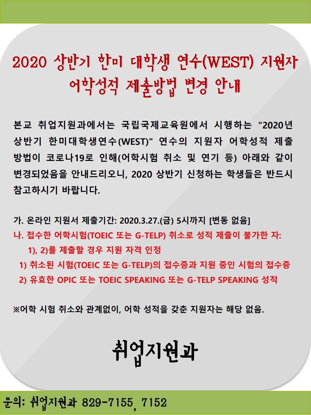 "생명과학·반려동물산업의 선두주자!"2020년 상반기 한・미 대학생 연수(WEST) 지원자 어학성적 제출방법 변경 안내