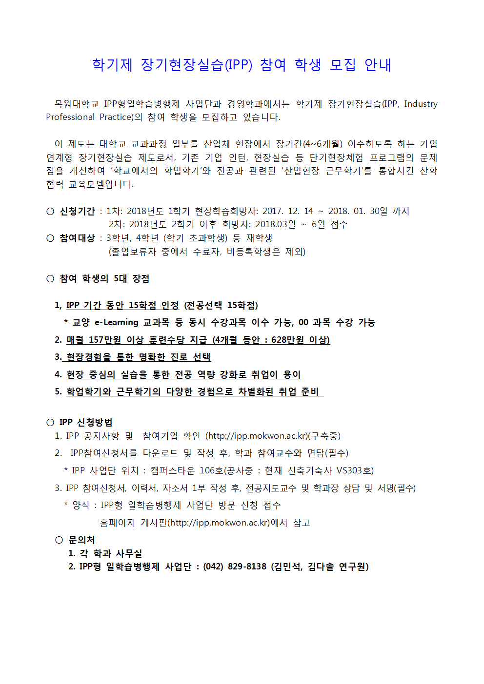 기업의 요구와 학생의 미래를 반영하는목원대학교 IPP형일학습병행제 사업단과 경영학과에서는 학기제 장기현장실습(IPP, Industry Professional Practice)의