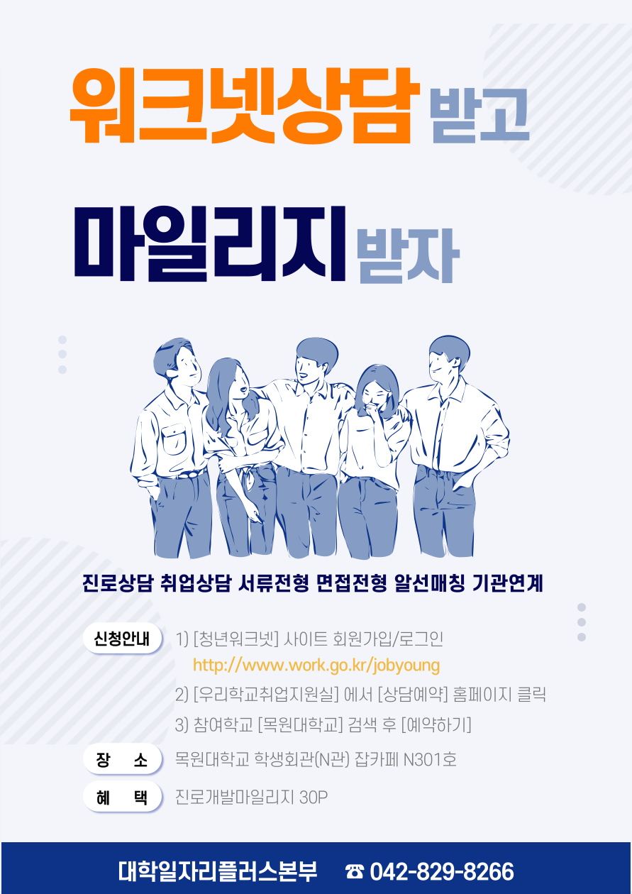 다. 신청방법 : 청년워크넷(www.work.go.kr/jobyoung) 회원가입/로그인-우리학교 취업지원실-상담예약-목원대학교 검색 후 예약
