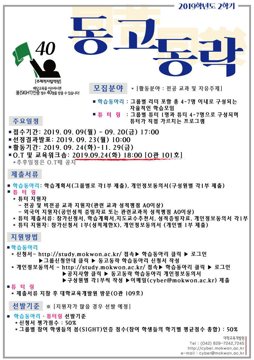 言語を学び、文化を理解し、世界に出よう!,学习语言,了解文化,走向世界!대학교육개발원에서는 2019-2학기 다차원 통합활동 1인 1자기 성장나무 키움 프로젝트 ‘동고동락’ 프로그램을 많은 학생들이 참여할 수 있도록 재홍보 요청하오니, 각 학부(과)에서는 많은 학생들의 참여 바랍니다.