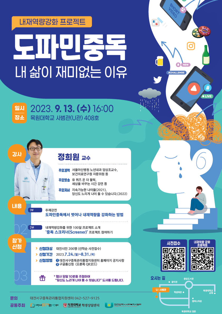 言語を学び、文化を理解し、世界に出よう!,学习语言,了解文化,走向世界!학생처 학생상담센터에서는 대전서구중독관리통합지원센터와 연계하여 지역사회 구성원들이 중독문제에 대한 경각심을 가지고, 중독사회에서 스스로 보호할 수 있는 역량을 가질 수 있도록 본교 재학생들을 대상으로 중독예방세미나를 실시하고자 합니다.