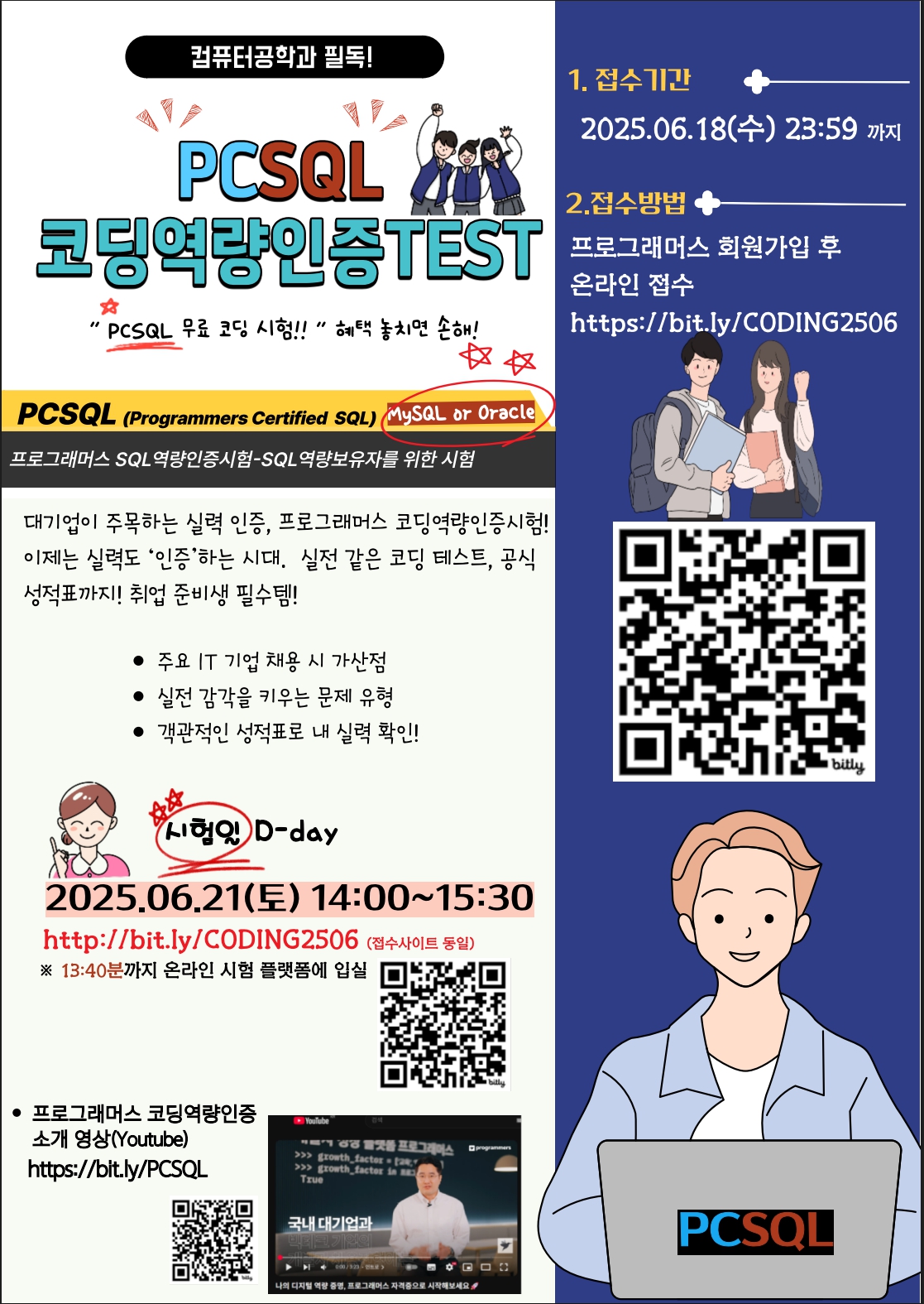 자신의 코딩 실력을 점검하고 성장의 발판을 마련할 수 있는 프로그래머스의 PCSQL(MySQL or Oracle) 코딩테스트 무료로 선착순 50명 접수하여 실시하오니, 전 학년 학생들의 많은 참여 바랍니다.