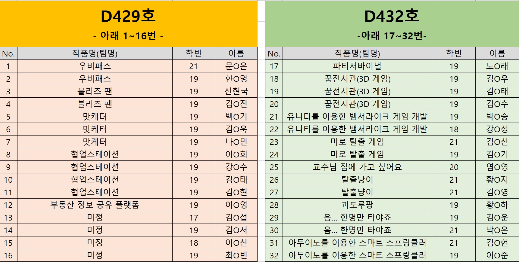 3. 장소 : D429호, D432호 / 아래 팀별 강의실 배정 확인