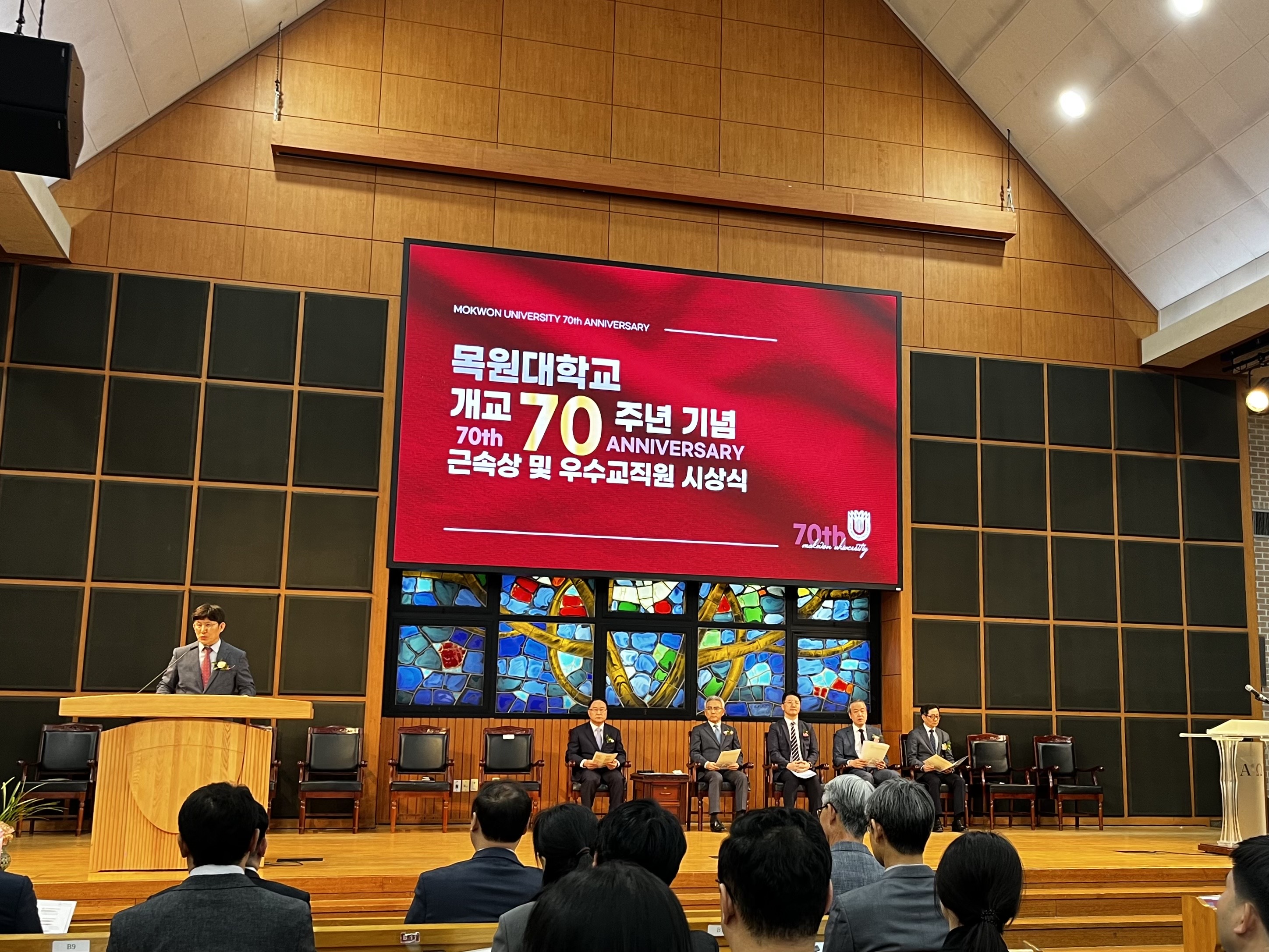 개교 70주년 행사, 최재명 교수님의 장기근속상 시상식 사진 입니다.