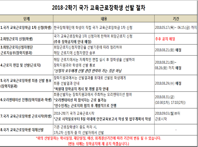 2018학년도 2학기 국가 교육근로장학생 희망근로지 신청 및 선발과정을 아래와 같이 안내합니다.