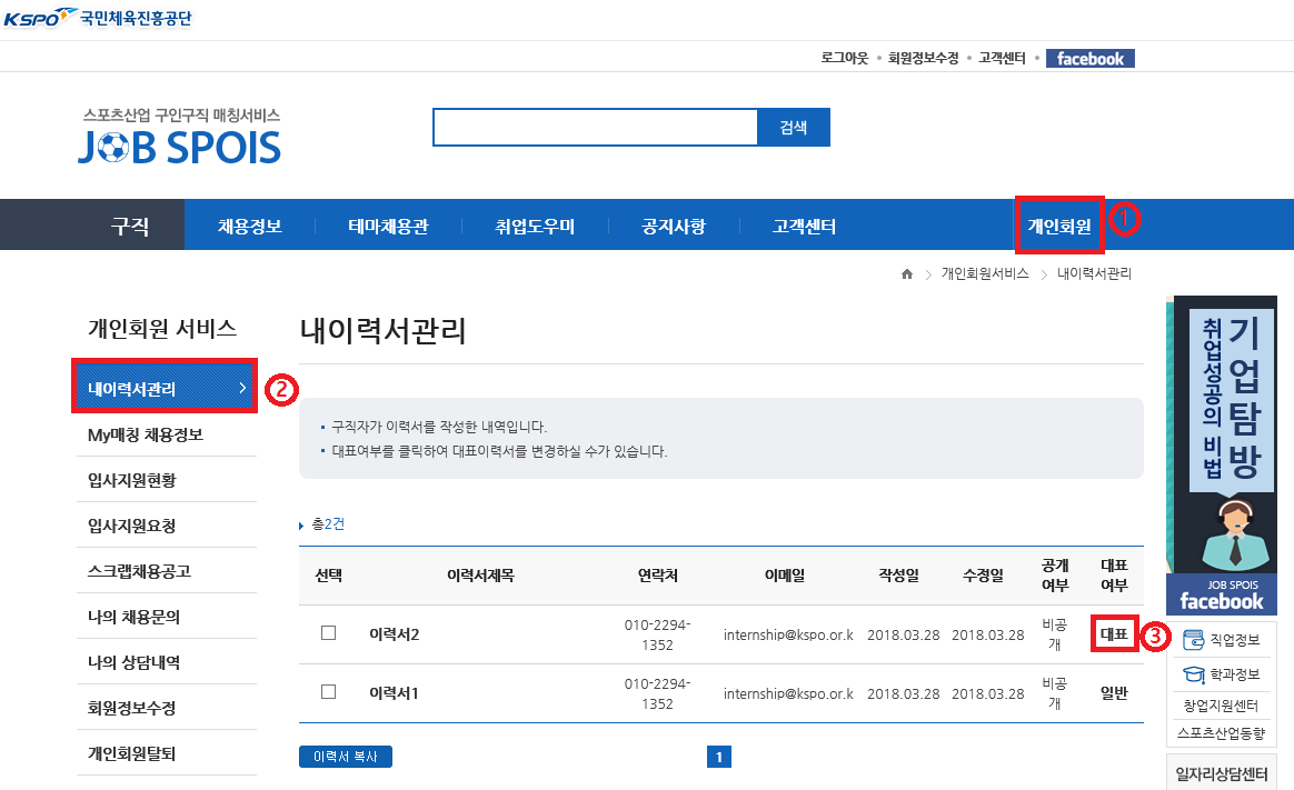 ※ 잡스포이즈(https://spobiz.kspo.or.kr/job/) → 개인회원 가입 후 이력서 작성 및 제출