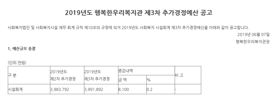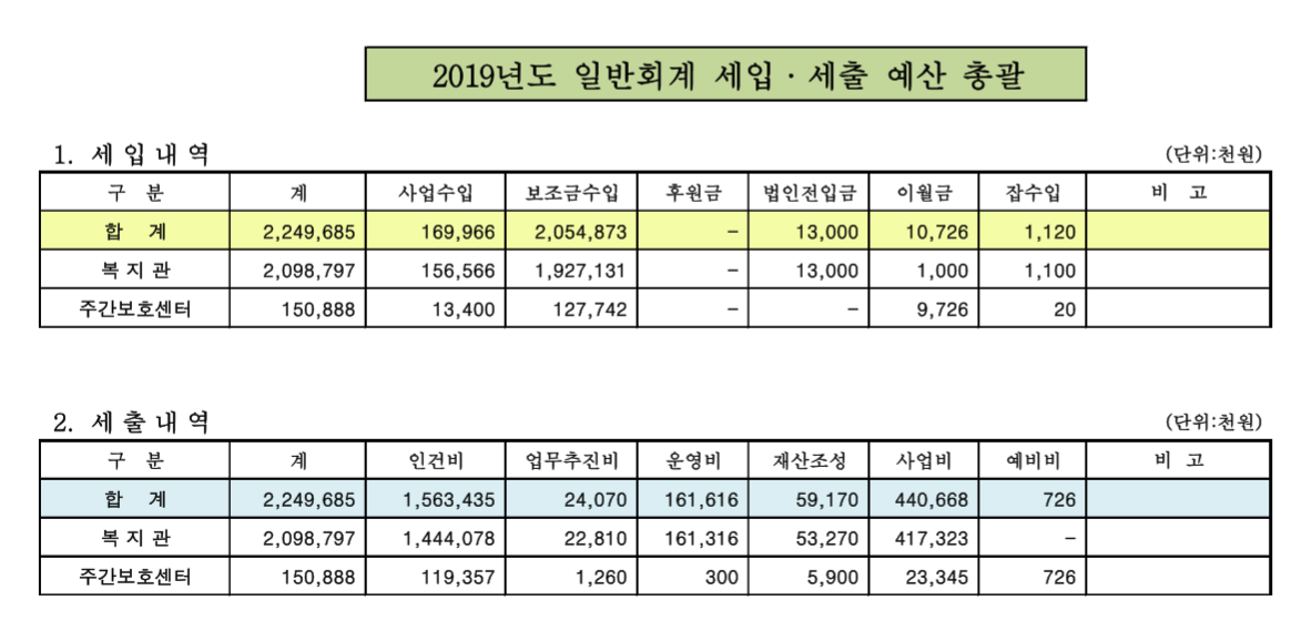 제1조 :2019년도 시설회계 세입·세출 예산총액을 각 일금 : 이십이억사천구백육십팔만오천원정으로 한다.