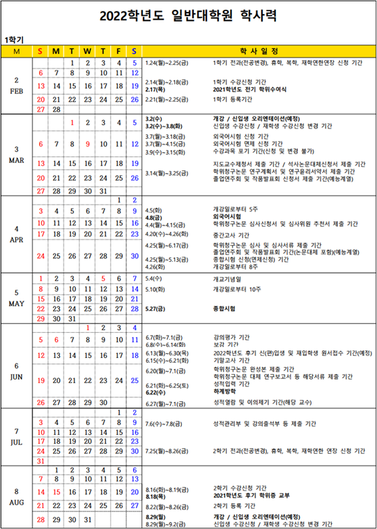 7) 원생의 졸업관련 필수 이행사항(외국어시험, 종합시험, 논문(대체), 학점이수 등)은 본인 스스 로가 기억하고 챙겨야 할 사항입니다. 원생께서는 매 학기 학사력을 반드시 숙지하시고 졸업요 건에 차질이 없도록 신경쓰시기 바랍니다.