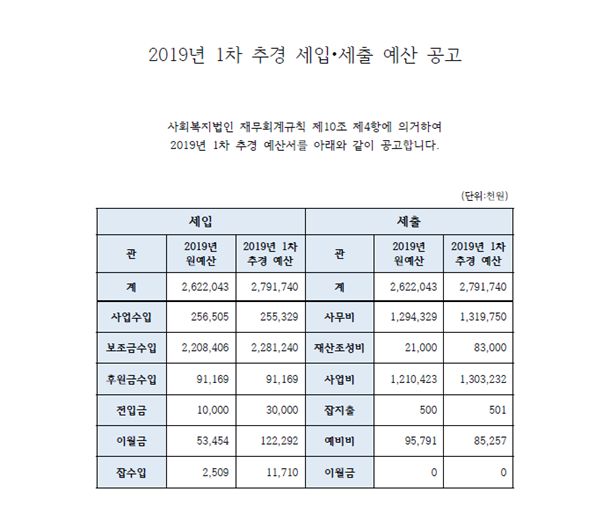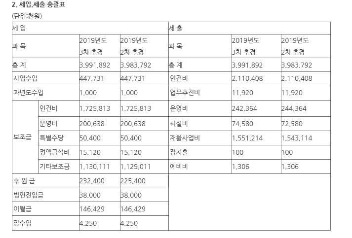 제1조 :2019년도 시설회계 세입·세출 예산총액을 각 일금 : 이십이억사천구백육십팔만오천원정으로 한다.