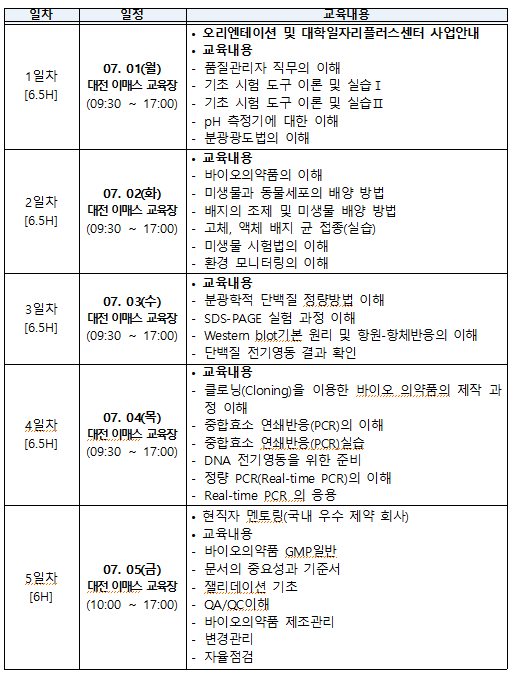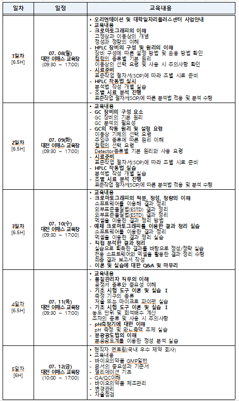 5. 교육내용 : 제약 바이오 분석 장비를 이용한 의약품 공정 이론 및 실습과 품질분석직무 이해 및 우수제약회사 현직자 멘토링