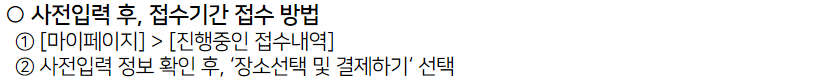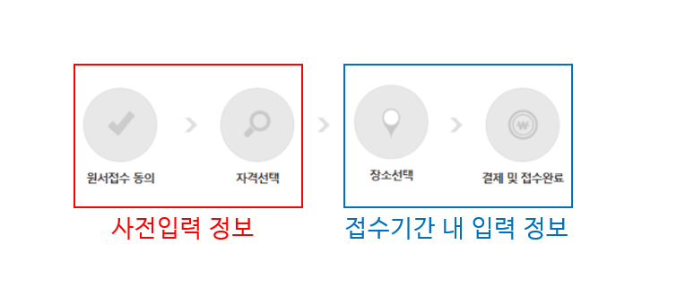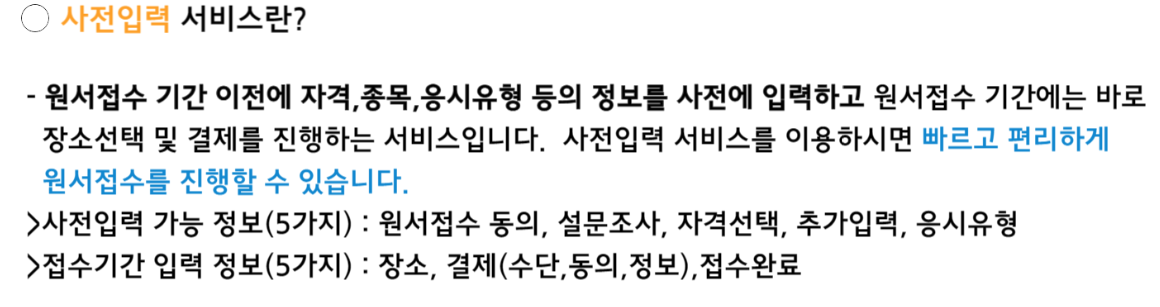 * 도입 시점 : (기사 필기) `24년 정기 기사 제3회 필기시험 원서접수부터(`24.6.18~) (기사 실기) `24년 정기 기사 제2회 실기시험 원서접수부터(`24.6.25~) □ 원서접수 사전 입력 서비스 실시 ○ (사전입력 서비스) 원서접수기간 이전에 종목, 응시유형 등의 정보를 사전에 입력하고 원서접수기간에는 바로 장소 선택 및 결재 진행 - 원서접수 전 사전입력 시 접수 초일 빠른 접수 가능
