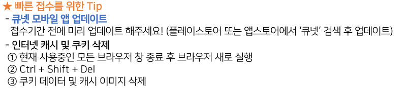 □ 유의사항 ○ 원서접수 전, 접수 예정 지역(필기), 등급별(실기) 접수 가능 시간 확인 ○ 접수 초일은 대규모 접속으로 인해 혼잡이 예상되므로 사전 입력 서비스 실시 요청 ※ 기타 자세한 사항은 큐넷 홈페이지 공지사항 참조 한국산업인력공단 |